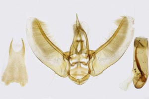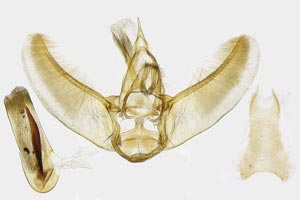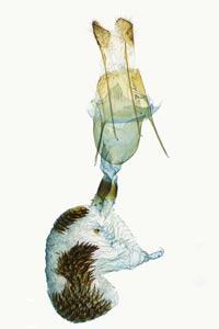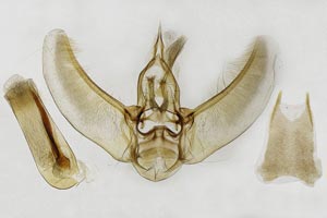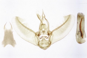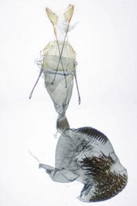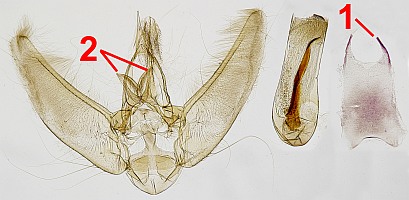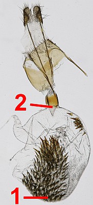 1: Genitalpräparat des unter Lebendfalter 1 abgebildeten ♂, Österreich, Niederösterreich, Arzberg 5 km S Pitten, 8. Juni 2002 (Präparation & Mikro-Foto: Peter Buchner)