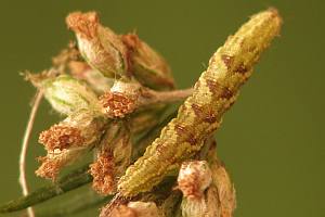 - vier schuppige Cornuti, die nicht verbunden sind (2); einer meist deutlich größer als die anderen drei