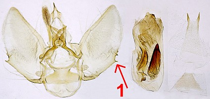 • die ♂ Genitalien sind durch ein Merkmal bereits gut charakterisiert: Valvenrand mit 1 - 2 feinen, spitzen Zähnchen (1).