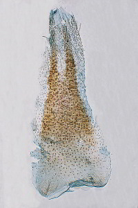 - Lage und Form der Dornenfelder: ein aufgelockertes (1) im Anschluss an das Colliculum, ein zweites auffällig kompaktes, schrägliegendes, kappenförmiges (2) gegenüber