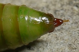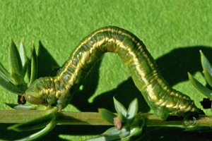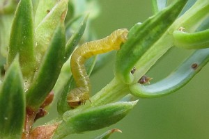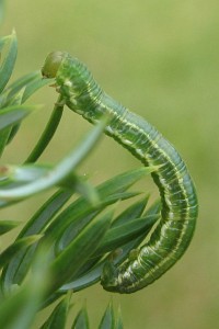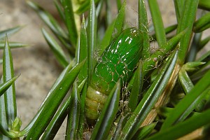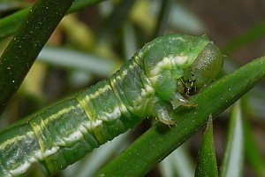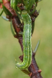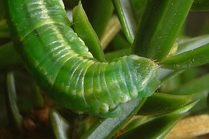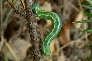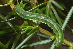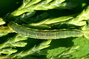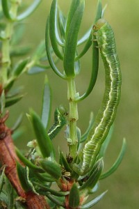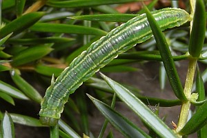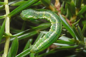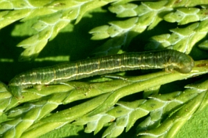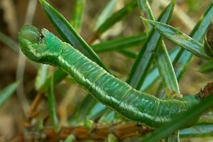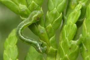 Die Raupe lebt primär am Gewöhnlichen Wacholder, geht in den Gärten aber auch an andere Juniperus-, Thuja- und Chamaecyparis-Arten.