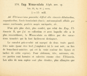 Mentzer & Moberg (1992) beschreiben - auf der Basis von 2 Männchen und 6 Weibchen - Eupithecia herrenschmidti als neue Art aus Spanien (Orjiva, Andalusien). Sie vergleichen sie mit den verwandten Arten E. opisthographata, E. inversaria, E. inquinata, E. penultimaria und vor allem E. ultimaria. Zu letzterer stellen sie u.a. Eupithecia minusculata als Synonym und begründen: "E. minusculata was described from a single female, wingspan 15 mm. The synonymization with E. ultimaria is convincing in view of the identity of the genitalia as figured in Peterson 1909." Sie schließen weiter: "To judge from the description and the figure of E. minusculata, from the description of T. tornifascia and T. arenicola as well as from the colour-slide of T. tornifascia. the Asiatic and African populations can be united under the name E. ultimaria minusculata Alphéraky for a paler subspecies with a well outstanding whitish postdiscal band on the forewings."