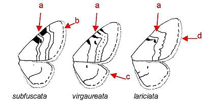 Die Aufhellung auf dem Thorax ist bei Eupithecia virgaureata dreieckig und nicht rechteckig gerundet (aus zwei zusammengeflossenen Teilflecken bestehend). Die Wellenlinie zeigt über dem Analwinkel einen weißen Punkt, dieses Merkmal gibt es bei E. lariciata nicht. Weitere Unterscheidungsmerkmale zwischen Eupithecia lariciata und Eupithecia virgaureata siehe [Beitrag von Helmut Kolbeck]