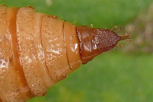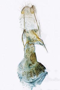 - In der distalen Hälfte nicht verschmälert, manchmal sogar in der Mitte leicht eingeschnürt, nur am Ende etwas sklerotisiert, U-förmig ausgeschnitten mit vorgezogenen Spitzen, hier asymmetrisch