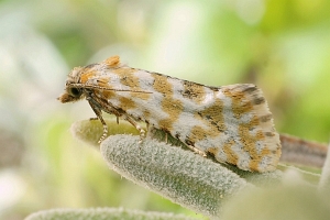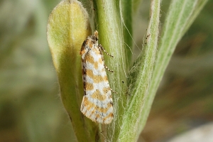 Eupoecilia cebrana ist von Ende April bis Mitte Mai an sandigen trockenen Stellen, in nur einer Generation, um die Raupennahrungspflanze Sandstrohblume (Helichrysum arenarium) anzutreffen. [Friedmar Graf]