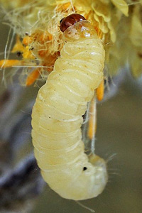 Die Art scheint ganz an die Sand-Strohblume gebunden zu sein. Kennel (1913: 309) schrieb dazu: "Die Raupe lebt in den Blüten von Gnaphalium arenarium in einer Gespinströhre und verpuppt sich unter Pflanzenabfällen; als Fundzeit wird sowohl der Mai als auch Juli und August angegeben; es gibt also wohl zwei Generationen, von denen wohl die eine vom Herbst bis Mai, die andere im Juh bis August lebt."