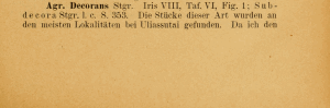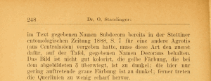 - Erstbeschreibung: Staudinger, O. (1897): Ueber Lepidopteren von Uliassutai. — Deutsche Entomologische Zeitschrift Iris 9 (2): 240-283.