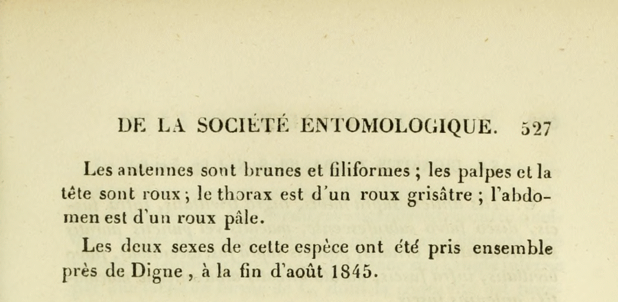 - Erstbeschreibung: Donzel, H. (1847): Description de lépidoptères nouveaux. — Annales de la Société entomologique de France. Deuxième Série 5: 525-530 + pl. 8. Paris.