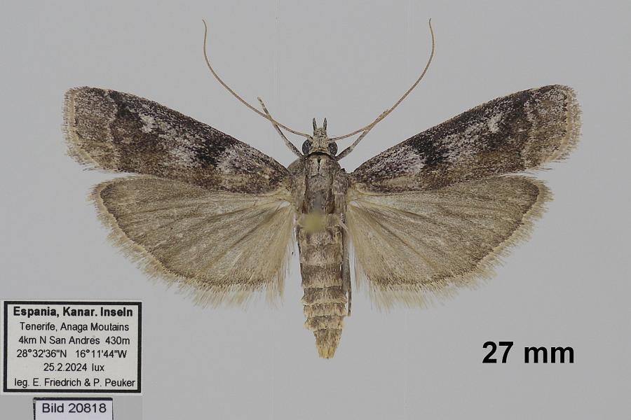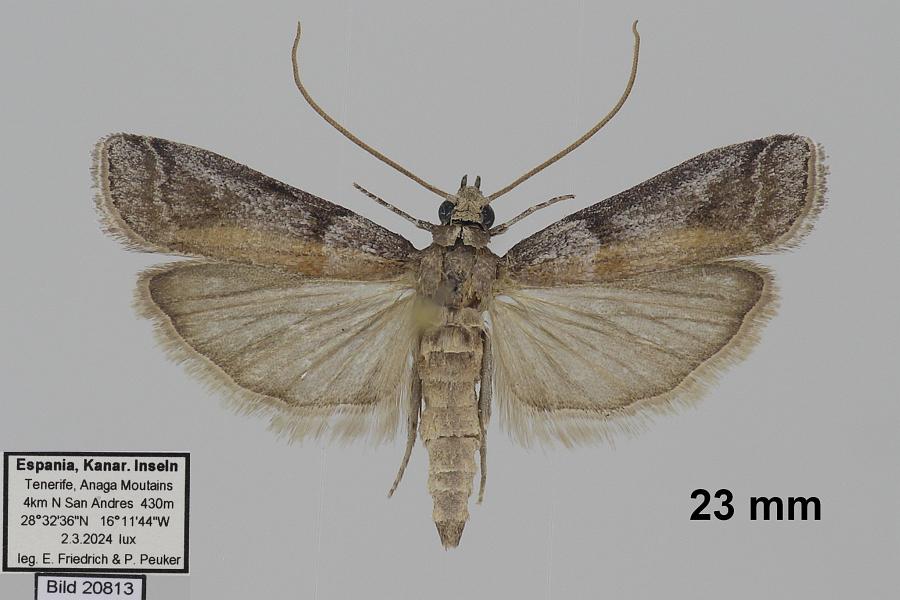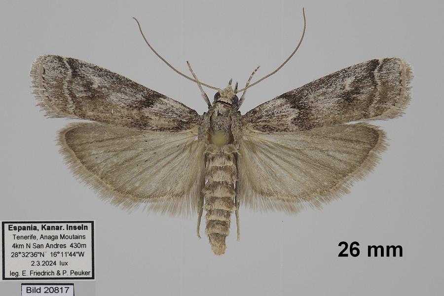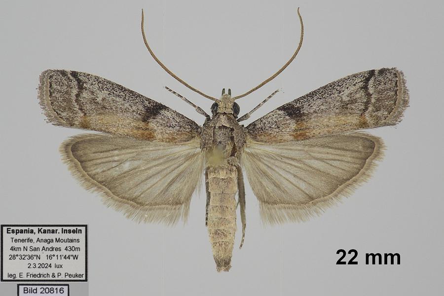 Die Artbeschreibung beruht auf einer größeren Falterserie von verschiedenen Inseln der Kanarischen Inseln. Falck et al. (2022: 473) melden: Holotype ♂: SPAIN, Gran Canaria, Pie de la Cuesta, 500 m, 11-24-VI-2018, leg. P. Falck (ZMUC). Paratypes: SPAIN, Gran Canaria, Pie de la Cuesta, 500 m, 24 ♂♂, 4 ♀♀, 11-24-VI-2018, leg. P. Falck, genitalia slides 3356PF, 3557PF, 3562PF; Barranquillo Andrés, 700 m, 7 ♂♂, 3 ♀♀, 11-24-VI 2018, leg. P. Falck; La Gomera, Hermigua, 250 m, 1 ♂, 24-X-12-XI-2021, leg. P. Falck; La Palma, Las Toscas, 150 m, 2 ♂♂, 1 ♀, 17-23-I-2019, leg. P. Falck, DNA sample Lepid Phyl 0948PF/CILEP0947- 21; Los Cancajos, 20 m, 2 ♂♂, 17-23-I-2019, leg. P. Falck, genitalia slide 3563PF; Tenerife, Los Gigantes, 50 m, 3 ♂♂, 8-22-XI-2016, leg. P. Falck, genitalia slide 2601PF; Tamaimo, 550 m, 3 ♂♂, 4 ♀♀, 8-22-XI-2016, leg. P. Falck, genitalia slide 2603PF; Playa Paraiso, 50 m, 1 ♂, 1-20-III-2017, leg. P. Falck; Las Mercedes, 750 m, 1 ♀, 18-XI-8-XII-2018, leg. P. Falck; Arona, 670 m."