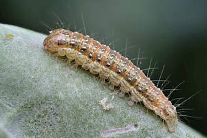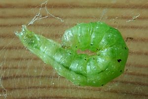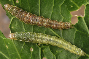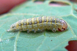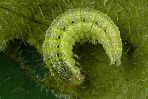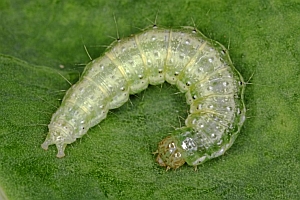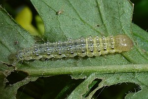 Kaltenbach (1856: 190) listete die Raupe unter Alliaria petiolata (als "Alliaria officinalis") auf und vermerkte: "Diese in allen Gassen vorkommende Zaunpflanze wird von keinem Insekte bewohnt, das nicht auch auf andern Cruciferen gefunden würde. 1. Die 10 — 12"' lange Raupe eines Zünslers (Botys forficalis) lebt von den wurzelständigen grossen Blättern, die sie unterseits durchlöchert oder auch wohl bis auf die Mittelrippe verzehrt. Man trifft sie im Mai und Juni, dann wieder von August bis Oktober. Sie ist 14füssig, grün, feingerieselt, mit weissen Punktfleckchen besprengt und mit einzelnen weissen Haaren bedeckt; über den Rücken laufen 2 ungleich breite, weissliche Streifen; eben so zieht an jeder Seite eine weisse Längsstrieme entlang. Sie verwandelt sich in der Erde und entwickelt sich, nach Bouché im Mai, nach eigener Beobachtung im August, zum Schmetterling."