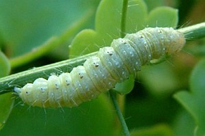 Die Raupe lebt an einer Vielzahl an Kreuzblütlern (Brassicaceae). Schon Linnaeus (1758: 533) stellte fest: "Habitat in Brassica." Und Möschler (1861: 37) meldete: "Rpe. auf Kohl, Meerrettig, und anderen Küchengewächsen." Auch heute noch werden alle Kohlsorten regelmäßig genutzt, ebenso Raps, Rübsen, Ackersenf und Rettiche. Daten zu Wildpflanzen liegen vergleichsweise wenige vor. Die obige Liste beruht auf Daten im Lepiforum und eigenen Beobachtungen. Für Levkoje und Löffelkraut kenne ich keine konkreten Angaben, die Pflanzen sind aber sicher plausibel. Die Liste der genutzten Kreuzblütler lässt sich sicher noch stark erweitern. Überhaupt nicht plausibel und sehr wahrscheinlich falsch sind Internet- und Literatur-Angaben zu Apium oder Rumex.