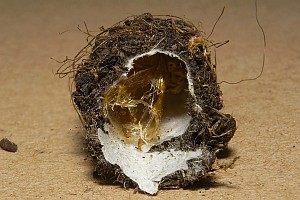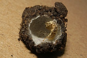 4: Erdkokon mit Überwinterungs- und Verpuppungsgespinst und Puppenexuvie, Deutschland, Sachsen, Doberschütz, Feldrand, leg. Raupe 8. Juni 2008, e.l. 22. April 2009 (Foto: Heidrun Melzer), cult. & det. Heidrun Melzer