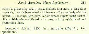 1: Lectotypus: Ecuador, Alausi, 9450 ft., Juni 1914, leg. Parish, coll. NHM London unter Nr. NHMUK010891410, Genitalpräparat 4742 + Lectotypen-Festlegung durch J.F.G. Clarke am 30. Mai 1947 (Belegfoto: Peter Buchner)