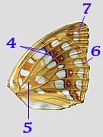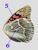 5 - weißer, oft schwarzgekernter Fleck an Basis der Hinterflügel