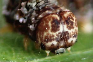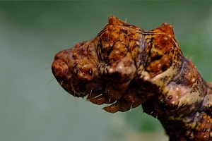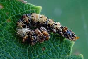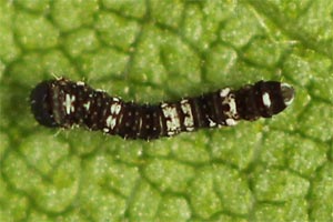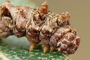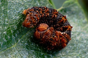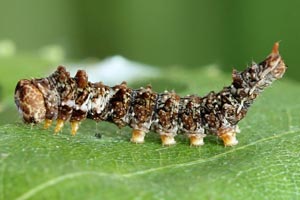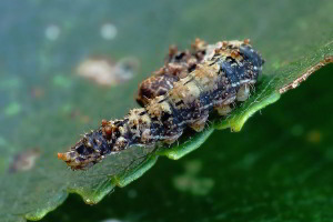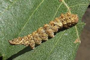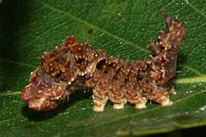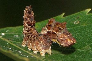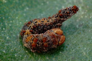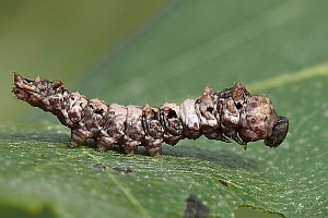 13: Dänemark, Jütland, Grenaa, 10 m, 2 km von der Küste entfernt, in einer Plantage an Birke Betula pendula in 1 m Höhe, Länge der Raupe 12 mm, Tagfund, 1. Oktober 2013 (det. & Freilandtoto: Kjeld Brem Sørensen). Das Bild zeigt die typische Verteidigungsstellung bei Raupengrößen kleiner 15 mm.Forum