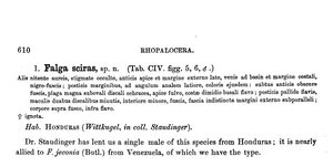 - Erstbeschreibung: Godman, F. D. & O. Salvin (1879-1901): Biologia Centrali-Americana. Insecta. Lepidoptera-Rhopalocera. Vol. III. (Plates.): pl. 1-24, 24a, 25-112. — Digitalisat auf biodiversitylibrary.org: [pl. 104 figs. 5-6]