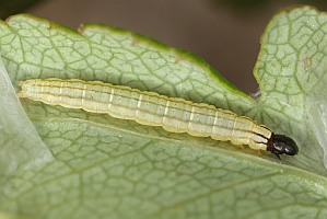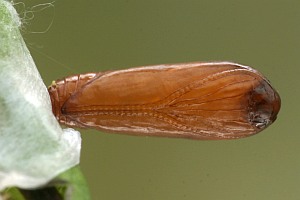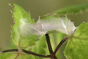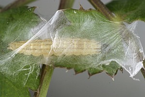 Die Meldung geht auf Krone (1905: 98-99) zurück, der die Raupe detailliert beschreibt und auch zur Lebensweise weit mehr berichten kann: "Die sehr lebhafte Raupe kommt im Juni auf Peucedanum cervaria vor. Sie zieht ein Blatt, zumeist auf der Oberseite, leicht zusammen und überspinnt diese seichte Rinne mit einer weißen, seidenartig glänzenden Brücke, unter welcher sie verborgen lebt. Berührt man dieses Gewebe, so flüchtet die Raupe durch einen Sprung zum Boden, wo sie wohl kaum wieder gefunden wird. Sie frißt nur die Spitze des Blattes, verläßt dieses etwa nach jeder Häutung und erneuert an einem frischen Blatt eine gleiche Brücke. Zur Verpuppung spinnt sie in den Ecken des Zuchthäuschens ein papierartiges gelblichweißes Netz, in welchem die zarte, licht braungelbe Puppe ruht. Der Falter kommt anfangs Juli zur Entwicklung."