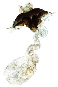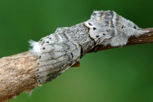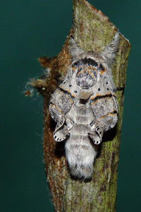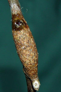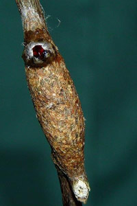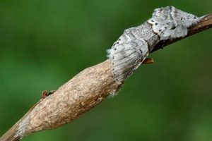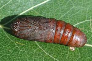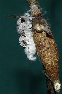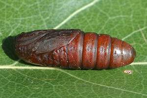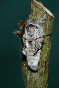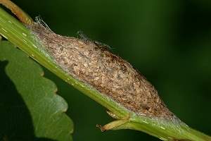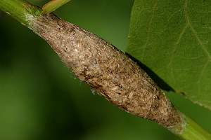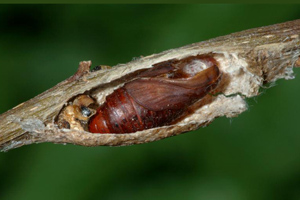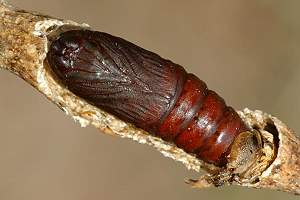 7: Exuvie, Niederlande, Zuid Flevoland, Zeewolde, Erkemederpad, an Populus x canadiensis, Raupe vom 18. Juli 2006, Raupe verpuppt: 24. Juli 2006, Falter geschlüpft: 8. August 2006 (Foto: Allan Liosi), det. Thomas Fähnrich