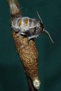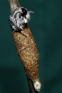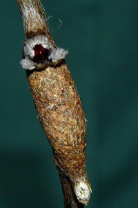 1-2: Kokon, Daten s. Raupe 1-3, Verpuppung in der Nacht vom 23. zum 24. Juli 2006 (Fotos: Allan Liosi), cult. Allan Liosi