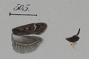 1-2: Herrich-Schäffer ([1853]: Tineides pl. 68 fig. 505) [reproduziert von Jürgen Rodeland nach Band im Staatlichen Museum für Naturkunde Karlsruhe]
