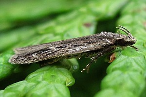 3-5: Vorderflügellänge 6 mm, errechnete Spannweite 13 mm, ♂, Deutschland, Niedersachsen, Rodenberg, Garten, 70 m, Raupengespinst 6. April 2014 an Thuja spec., e.l. 23. Juni 2014 (leg., cult., det. & fot.: Tina Schulz), conf. durch GU Peter BuchnerForum