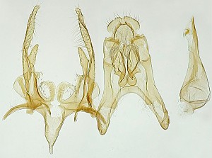 1: Präparat des unter Lebendfoto 3-5 abgebildeten ♂, Deutschland, Niedersachsen, Rodenberg, Garten, 70 m, Raupengespinst 6. April 2014 an Thuja spec., e.l. 23. Juni 2014 (leg. & cult. Tina Schulz, Präparation & Mikrofoto: Peter Buchner)Forum