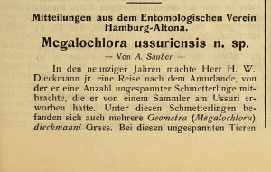 - Erstbeschreibung: Sauber, A. (1915): Megalochlora ussuriensis n. sp. — Internationale Entomologische Zeitschrift 8 (36): 203.