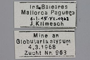 [Hinweis: In der Erstbeschreibung ist zu lesen: „Der Beschreibung liegen 16 ♂♂ und 24 ♀♀ mit der Bezettelung Paguera, Mallorca, e.l. 15.VI.-5.VIII.1968 zugrunde. Der Holotypus und die Paratypen werden in meiner Sammlung verwahrt.“ Demnach ist davon auszugehen, dass das hier gezeigte Exemplar zur Serie der Paratypen gehört.]