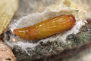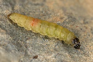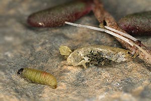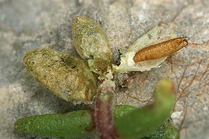 Die Art lebt als Raupe ausschließlich an Dickblattgewächsen (Crassulaceae). Nach oben gezeigter Raupe und bladmineerders.nl [Artseite auf bladmineerders.nl] findet sie sich im Stängel und in Blättern von Sedum-Arten (Mauerpfeffer). Interessanterweise führen Schmalstieg & Kummer (o.J.) [aufgerufen 4. Dezember 2014] die Art für Berliner Gärtnereien als "Schaderreger in den Spezialkulturen" an, konkret: "Auftreten: an Aeonium arboreum (Crassulaceae); Bedeutung: schädigt durch Minieren stark den dekorativen Wert der Pflanzen [...] Miniert in den Blättern und Stängeln." Aeonium arboreum ist ein gerne in Zimmern gehaltener Kanaren-Endemit, der mittlerweile in Teilen des Mittelmeerraums verwildert ist. Bezogen auf den Falter wäre es interessant zu erfahren, ob es sich bei den Raupen an Aeonium hier um die in Europa weit verbreitete (aber durchweg seltene) nominotypische Unterart oder um die auf den Kanaren heimische Unterart Glyphipterix equitella ssp. crassilunella handelt.