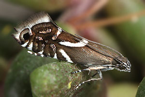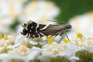 Die Art lebt als Raupe ausschließlich an Dickblattgewächsen (Crassulaceae). Nach oben gezeigter Raupe und bladmineerders.nl [Artseite auf bladmineerders.nl] findet sie sich im Stängel und in Blättern von Sedum-Arten (Mauerpfeffer). Interessanterweise führen Schmalstieg & Kummer (o.J.) [aufgerufen 4. Dezember 2014] die Art für Berliner Gärtnereien als "Schaderreger in den Spezialkulturen" an, konkret: "Auftreten: an Aeonium arboreum (Crassulaceae); Bedeutung: schädigt durch Minieren stark den dekorativen Wert der Pflanzen [...] Miniert in den Blättern und Stängeln." Aeonium arboreum ist ein gerne in Zimmern gehaltener Kanaren-Endemit, der mittlerweile in Teilen des Mittelmeerraums verwildert ist. Bezogen auf den Falter wäre es interessant zu erfahren, ob es sich bei den Raupen an Aeonium hier um die in Europa weit verbreitete (aber durchweg seltene) nominotypische Unterart oder um die auf den Kanaren heimische Unterart Glyphipterix equitella ssp. crassilunella handelt.