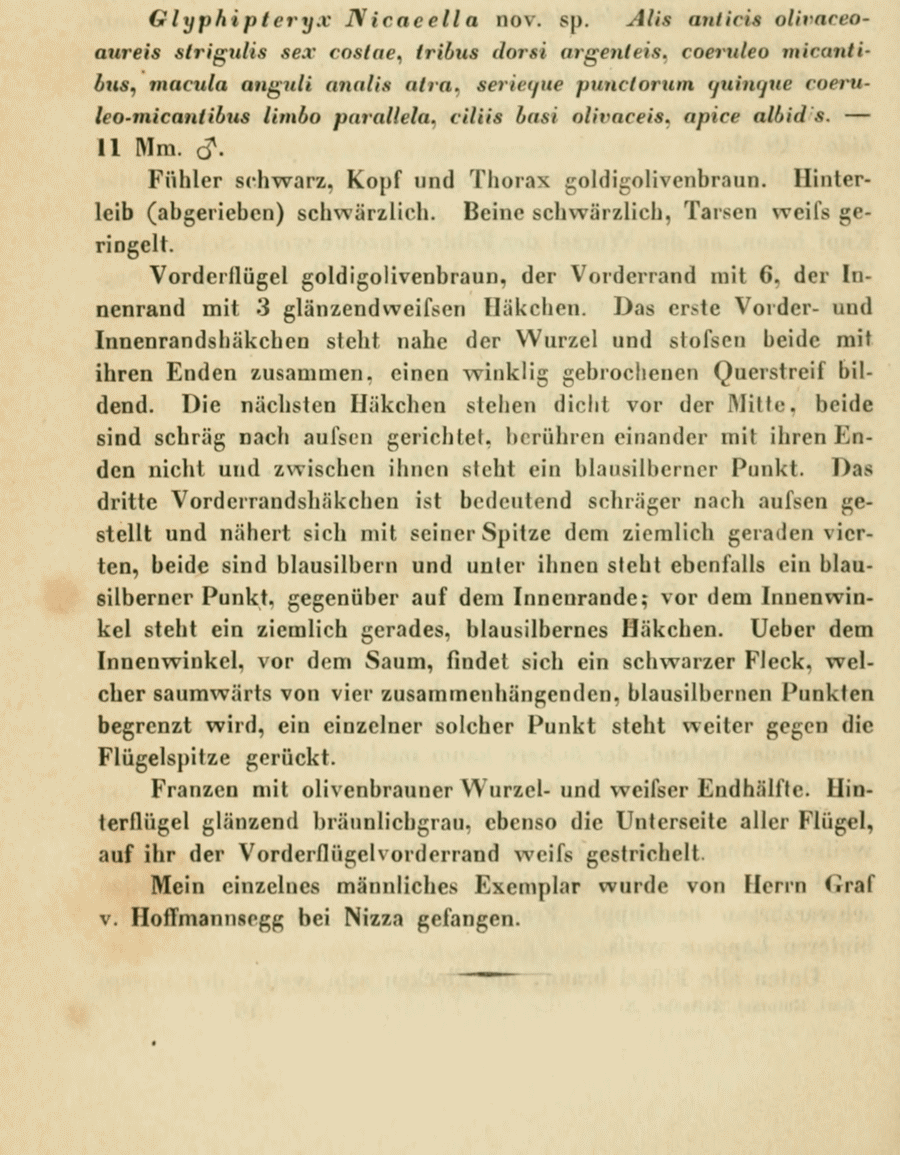 Möschler (1866) schreibt: "Mein einzelnes männliches Exemplar wurde von Herrn Graf v. Hofmannsegg bei Nizza gefangen." Die Art wurde also nach dem Typenfundort benannt.