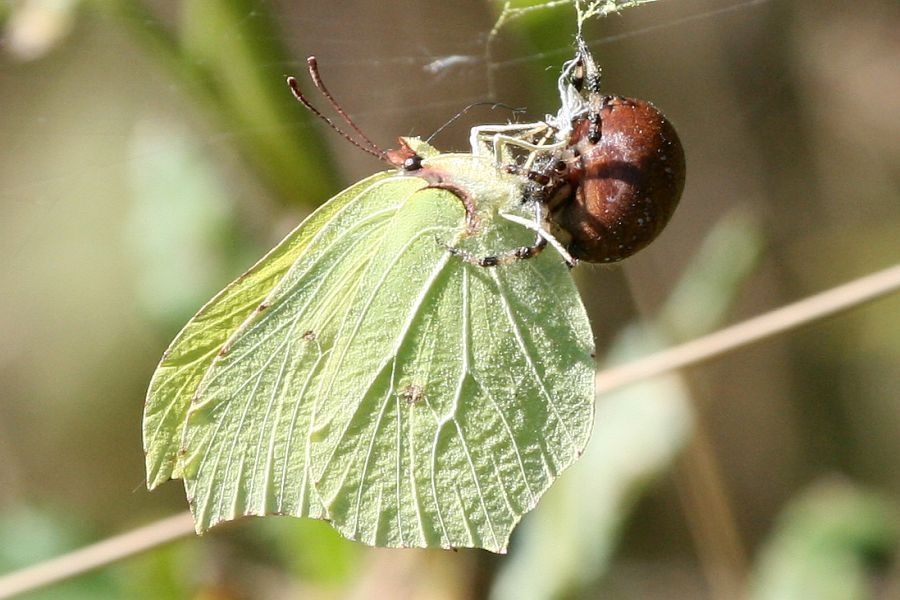 Im Mittelmeerraum tritt auch noch G. cleopatra auf. Dessen ♂ fällt durch einen sehr großen orangeroten Fleck auf der Vorderflügel-Oberseite sofort auf. Das ♀ ist „unserem“ Zitronenfalter sehr ähnlich. Die Färbung ist etwas heller weiß, nicht grünlich und seine Hinterflügel sind etwas dunkler als die Vorderflügel. Eine besondere Schwierigkeit sind gelbe ♀ ♀ von G. cleopatra, wie sie vor allem in Griechenland, vereinzelt aber auch anderswo im Mittelmeerraum auftreten.