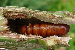 5-6: Jungraupe, Deutschland, Schleswig-Holstein, Alt Duvenstedt, Deponie, in Stängel von Ackerkratzdistel, 28. Juni 2009 (Fotos: Clas Lehmann), det. Thomas Fähnrich & Andreas Kahrer, Zuchtergebnis liegt nicht vorForum