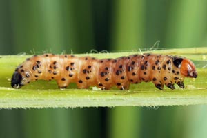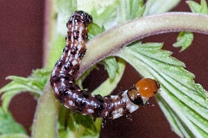 9: Jungraupe 8 mm, Deutschland, Baden-Württemberg, oberer Neckar, Gemarkung Talhausen nördlich Rottweil, ca. 520 m, Begleitflora am Neckartal-Radweg, im Stängelinneren von Scharfem Hahnenfuß (Ranunculus acris), oberes Pflanzendrittel durch Raupenbesatz überhängend, 10. Mai 2018 (Studiofoto: Peter Lacha), det. Daniel BartschForum