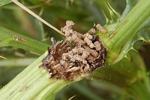 1-3: Befallsbilder an Ackerkratzdistel, Deutschland, Schleswig-Holstein, Alt Duvenstedt, Deponie, 28. Juni 2009 (Freilandfotos: Clas Lehmann, Bild 2 manipuliert)Forum