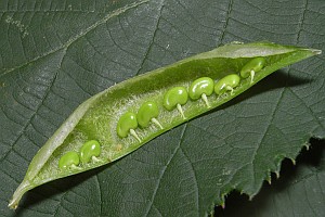 1: Fruchtstand von Tragant (Astragalus glycyphyllos), hier mit Raupensäcken von Coleophora gallipennella: Deutschland, Thüringen, Umgebung von Jena, 12. Juli 2011 (det. & Freilandfoto: Heidrun Melzer)