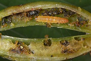 2: geöffnete Schote mit Samen, die den Raupen vorwiegend als Nahrung dienen, Fundort wie Bild 1 (Foto am 26. Juli 2011: Heidrun Melzer)