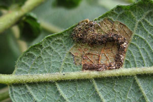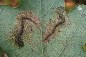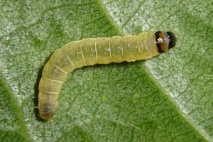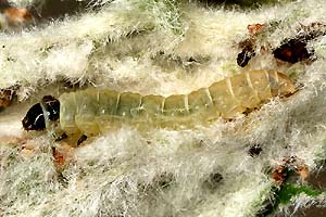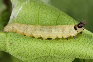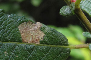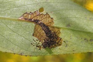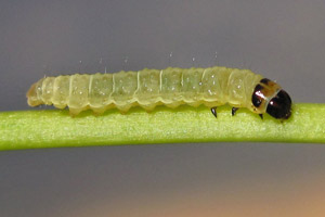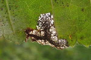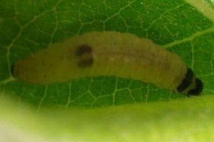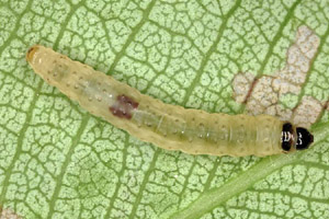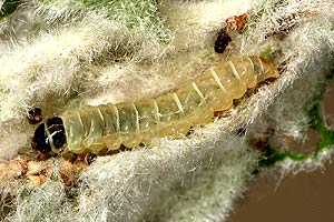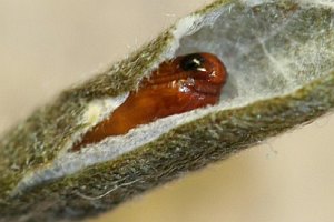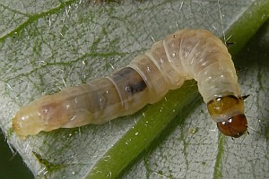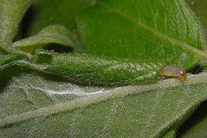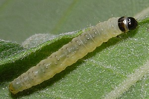 Schütze (1931: 52) trug dann zusammen: "Zwischen den versponnenen Herzblättern von Salix, Populus, Crataegus, Corylus, Quercus und anderen, dringt auch in das Mark der Zweige. Verwandlung an der Erde (Sorhagen). Raupe zwischen den Blättern von vielerlei Laubholz, besonders Quercus (Disqué). Raupe überwintert klein in den Knospen von Salix cinerea, ein Häufchen grauen Kotes zwischen Knospe und Trieb verrät sie (Schütze)."