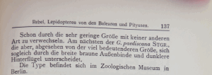 - Erstbeschreibung: Rebel, H. (1934): Lepidopteren von den Balearen und Pityusen. — Deutsche Entomologische Zeitschrift „Iris“ 48 (3): 122-138. Dresden.