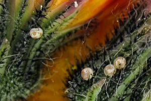 6: ♀, Deutschland, Sachsen, Altenberg im Erzgebirge, 800 m, ehemaliges Sportgelände aus den 1960er Jahren, jetzt mit Bergwiesencharakter (Dactylorhiza maculata, Briza media), Eier an Hybride aus Hieracium auranticum und H. iseranum, e.o. 16. Juni 2008 (Studiofoto: Franziska Bauer), cult. & det. Franziska BauerForum