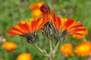1-2: an Hybride aus Hieracium auranticum und H. iseranum: Deutschland, Sachsen, Altenberg im Erzgebirge, 800 m, ehemaliges Sportgelände aus den 1960er Jahren, jetzt mit Bergwiesencharakter (Dactylorhiza maculata, Briza media) 16. Juni 2008 (Studiofotos: Franziska Bauer)Forum