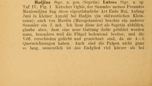 In der Erstbeschreibung von Staudinger (1892) ist zu lesen: "Katscher Oghle, der Sammler meines Freundes Manissadjian fing diese eigenthümliche Art Ende Mai, Anfang Juni in kleiner Anzahl bei Hadjin (im südwestlichen Kleinasien); auch von Mardin (Mesopotamien) brachte ein anderer Sammler ein ♂ mit. Ich liess diese Art als Segetia abbilden, glaube aber, dass eine neue Gattung dafür gebildet werden muss [...]"