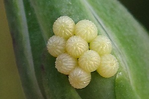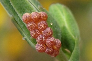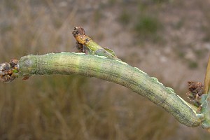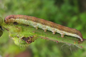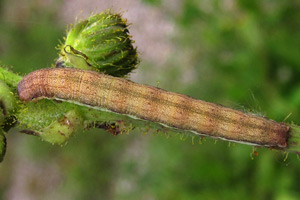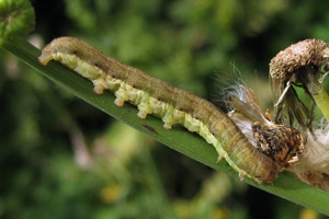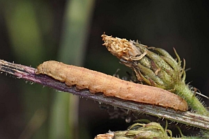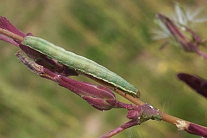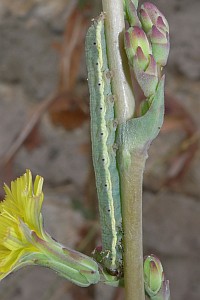 Mit großem Abstand wichtigste Nahrungspflanze der Raupe ist der Kompass-Lattich. Im Kehler Hafen fand ich über fast nacktem Kiesboden auch Raupen am in Deutschland seltenen Gift-Lattich. Raupen an durchgewachsenem Kopfsalat passen - da zur gleichen Gattung gehörend - gut ins Schema. An Mauerlattich oder Hasenlattich wird die Art vergleichsweise selten gefunden - was auch mit deren etwas abweichenden Standort-Ansprüchen zu tun hat. Bei der oben gezeigten Raupe an Habichtskraut-Bitterkraut (Picris hieracioides) wurde nicht auf Fraßspuren an der Pflanze geachtet - so wie sie dasitzt, spricht aber alles dafür, dass sie auch an dieser Pflanze fraß.