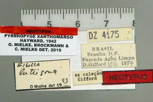 1-3: Neotypus ♂ von Pyrrhopyge xanthomargo, Daten siehe Etiketten (fot.: Carlos Mielke, Fotos bearbeitet: Michel Kettner), coll. Departamento de Zoologia, Universidade Federal do Paraná, Curitiba, Paraná, Brazil.