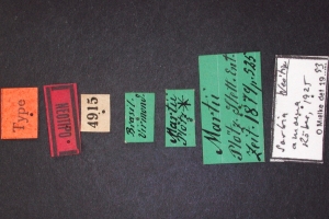 16-18: Holotypus ♂ von Pyrrhopyge martii, Daten siehe Etiketten (fot.: Bernard Hermier, Fotos bearbeitet: Michel Kettner), coll. Zoologisches Museum der Humboldt-Universität zu Berlin.