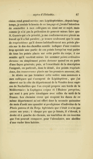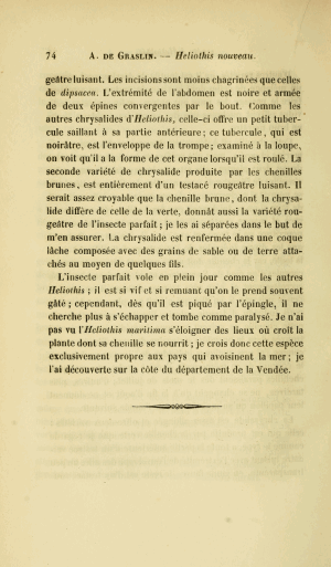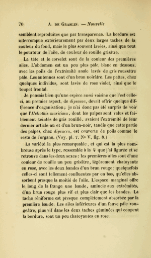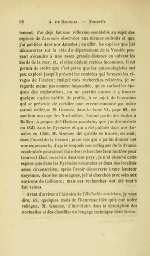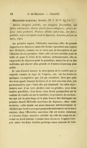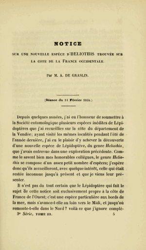 - Erstbeschreibung: De Graslin, A. (1855): Notice sur une nouvelle espèce d'Heliothis trouvée sur la cote de la France occidentale. — Annales de la Société entomologique de France. Troisième Série 3 : 65-74, pl. 7 V. Paris.