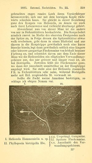 Schon Sorhagen (1885) beschrieb die Mine und das Fraßbild in Birken-Blättern sehr detailreich (siehe oben den Scan der Erstbeschreibung). Unklar ist nur noch, ob die Art auch an anderen Birken-Arten als der Hänge-Birke lebt.