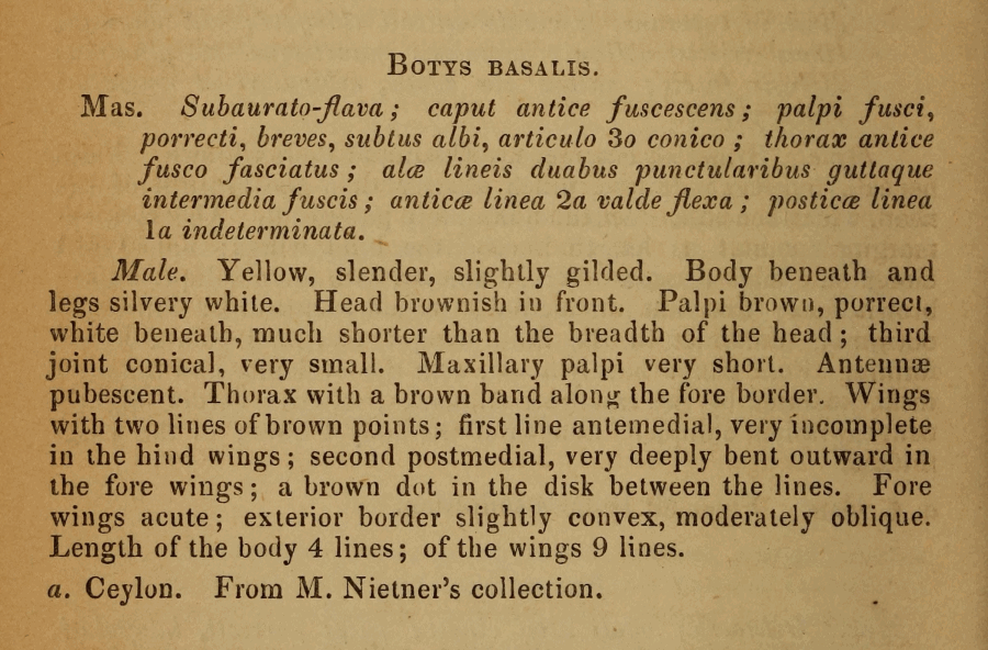 - Erstbeschreibung: Walker, F. (1866) ["1865"]: List of the Specimens of Lepidopterous Insects in the Collection of the British Museum 34 (= Supplement 4): 1121-1533. London.