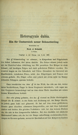 - Erstbeschreibung: Schmidt, F. J. (1860): Heterogynis dubia. Ein für Oesterreich neuer Schmetterling. — Verhandlungen der kaiserlich-königlichen zoologisch-botanischen Gesellschaft in Wien 10: 659-662. [Digitalisat auf biodiversitylibrary.org]