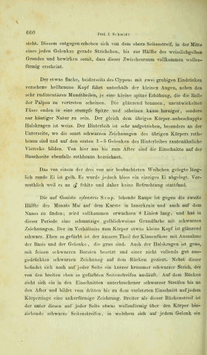 Schmidt (1860: 660) meldet in seiner Erstbeschreibung ausführlich: "Die auf Genista sylvestris Scop. lebende Raupe ist gegen die zweite Hälfte des Monats Mai auf dem Karste in Innerkrain und auch auf dem Nanos zu finden; wird vollkommen erwachsen 8 Linien lang, und hat in dieser Periode eine schmutzige gelblichweisse Grundfarbe mit schwarzen Zeichnungen. Der im Verhältniss zum Körper etwas kleine Kopf ist glänzend schwarz. Eben so gefärbt ist der äussere Theil der Klauenfüsse mit Ausnahme der Basis und der Gelenke, die grau sind. Auch der Halskragen ist grau, mit feinen schwarzen Borsten besetzt und einer nicht vollends gut ausgedrückten schwarzen Zeichnung auf dem Rücken geziert. Nebst dieser befindet sich noch auf jeder Seite ein kurzer krummer schwarzer Strich, der von den breiten eben so gefärbten Seitenstreifen ausläuft. Auf dem Rücken zieht sich ein in den Einschnitten unterbrochener schwarzer Streifen bis an den After und bildet vom dritten bis zu dem vorletzten Einschnitt auf jedem Körperringe eine ankerförmige Zeichnung. Breiter als dieser Rückenstreif ist der unter diesen auf jeder Seite etwas wellenförmig über den Körper hinziehende schwarze Seitenstreifen, in welchem sich auf jedem Gelenk ein etwas länglich runder mit einem schwarzen Börstchen versehener grauer Flecken befindet. Ober diesem Flecken erhebt sich in der Mitte eines jeden Gelenkes ein gerades schwarzes Strichchen, dass jedoch kaum bis an den halben Eaum der grauen Grundfarbe reicht. Unter diesen eben beschriebenen oberen Seitenstreifen zieht ein aus halbmondförmigen Zeichnungen zusammen gesetzter zitronengelber Streifen den Körper entlang, der unterhalb von einem ziemlich breiten schwarzen Streifen begrenzt wird. Auch in diesem Streifen befindet sich auf jedem Gelenk ein länglicher grauer Fleck. Die Stigmen sind gelblich weiss. Der Bauch, so wie überhaupt der ganze untere Eaum des Körpers ist gelblich grau mit schwarzen Strichen in der Mitte. Die Bauchfüsse und Nachschieber sind bräunlich gelb, nur sind die Letztern an den Tarsen schwärzlich begrenzt. Sobald die Raupe ihre vollkommene Ausbildung erlangt hat, das im Monate Juni der Fall ist, fertigt sie sich an der Futterpflanze selbst oder auch an anderen in der Nähe wachsenden Pflanzen ein 3 1/2 — 7 Linien langes silberweisses längliches Gespinnst. Gewöhnlich sind die Gespinnste der ♂ um die Hälfte kleiner."